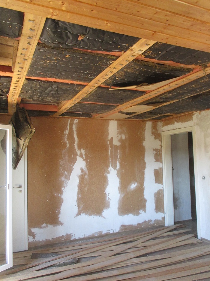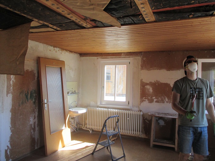 Danach wurde es etwas unangenehmer. Ich wollte die Holzdecke in einem der Räume entfernen. Die erste und einzige im Haus (zum Glück). In meiner Naivität dachte ich, man müsse nur mit dem Nageleisen wie bei der Schalung die Bretter wegziehen, halt von oben anstatt von der Seite. Falsch gedacht, dass sich über den Brettern Glaswolle befinden könnte, daran hatte ich nicht gedacht. Jedenfalls kam mit der Glaswolle auch noch viel Staub und Dreck aus der Decke ... und wenn ich das geahnt hätte, dann hätte ich diesen Job auch keinem externen Helfer zugemutet.