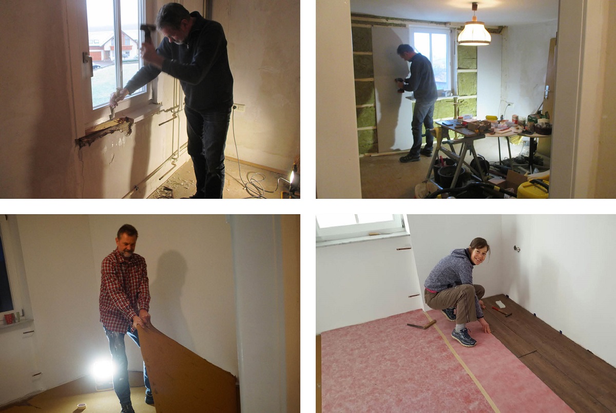The usual renovation process: built-in of the bathroom first, covering the walls, filling works, painting with brush-on plaster, renewal of the floor...
