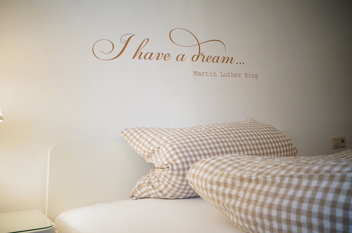 Generally speaking, I don't like tattoos. But after having thought about a nice picture for the room for days and not having found anything, I decided for a discreet wall tattoo instead. Such a nice line above a bed of great historic significance: In 1963, the American civil rights campaigner against racism and for equality, Martin Luther King held his speech "I have a dream".