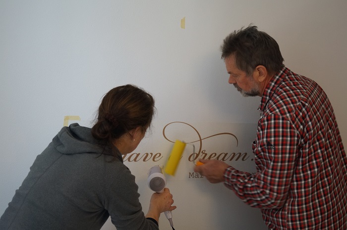 Die Befestigung war wieder eine Kunst für sich unter Einsatz von 3 Köpfen, 6 Händen, Fön und Walze. Aber die Aktion ist geglückt, es hängt nun.