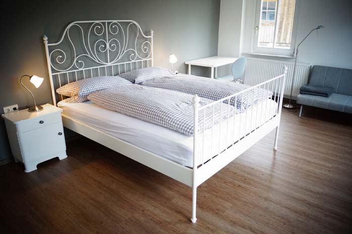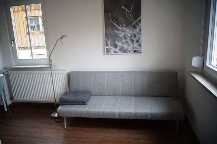 Und nun stelle ich begeistert ein weiteres Zimmer vor (das vorletzte Gästezimmer): das graue Zimmer! Es ist nach Ansicht aller, die drin waren, wunderschön geworden (ein Favoritenzimmer). Zudem ist wirklich alles dabei: Badezimmer, Balkon, Fensterfront, (Schlaf-)Sofa, Schreibtisch, Schrank und immer noch viel Platz!