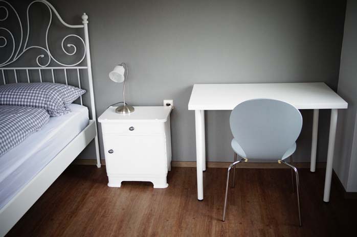 And I proudly present the next room (the penultimate guest room): the grey room! According to everybody who already saw it, it has become very beautiful (a favourite room). Further, it has really got everything: bathroom, balcony, window front, sleeping couch, desk, wardrobe and there is still free space!