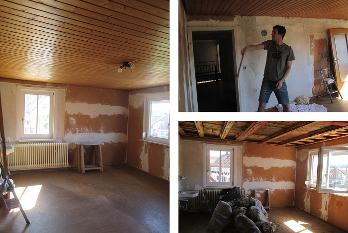 Well, first some pictures and words about the long-lasting renovation process. It started with a unique step in this house: getting rid of the wooden ceiling. A pretty dirty business (I had imagined something quite different). But thanks to the help of a skillful Dominique, this step has been performed last summer:
