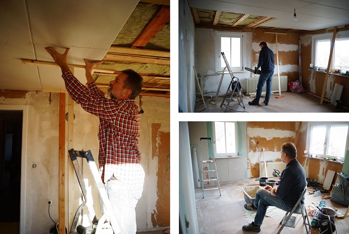 Ein paar Monate später ging es dann weiter: neue Decke aus Rigipsplatten befestigen, aber auch Waschbecken abnehmen, Rohre unterputz legen, Heizung austauschen, Wände verkleiden... Papa's job.