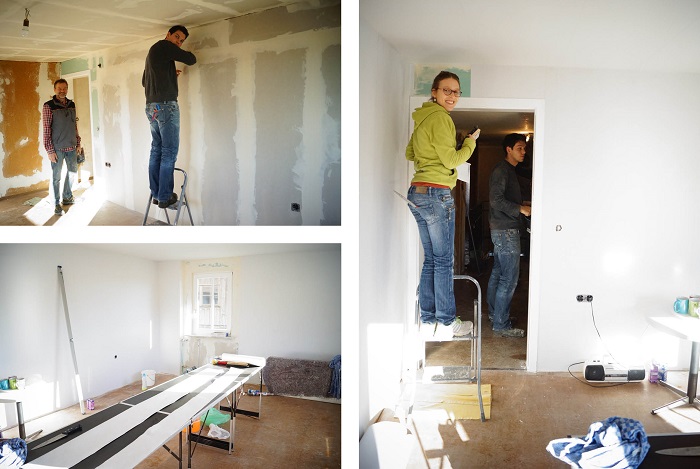 Und dann gab's viel zu verspachteln (da hab ich die erste Runde gemacht), bevor Ende 2016 noch tapeziert und gestrichen wurde.