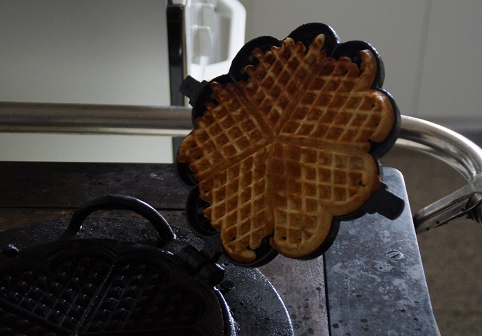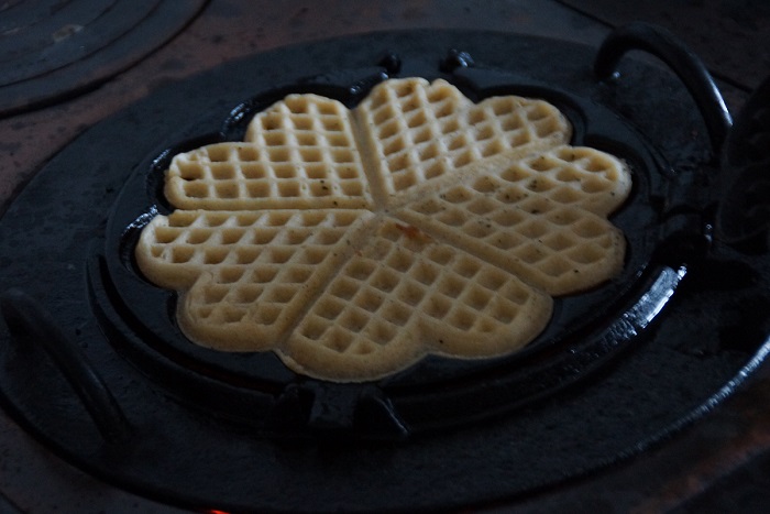 Also habe ich nochmals recherchiert, worauf es beim Backen von Waffeln auf dem Feuer ankommt: Natürlich muss man zuerst Feuer machen. Wichtig ist, dass das Feuer schon eine Weile brennt, und dass es genug Glut und somit Hitze gibt, bevor man zu backen beginnt. Wichtig ist auch, dass das Waffeleisen von beiden Seiten richtig vorgeheizt ist. Ist das der Fall, sollte man das Innere der Form mit Öl fetten. Und erst dann den Teig in die Form geben und die Waffel von beiden Seiten backen. Als ich die erste Waffel gebacken habe, war der Ofen noch so richtig schön heiß, sodass die Waffel nach eineinhalb Minuten auf dem Herd pro Seite knusprig durchgebacken war. Beim Backen hat es auch schön gezischt. Ich war begeistert, als ich das Ergebnis sah (nach der Aktion im Dezember hatte ich mir dem schlimmsten gerechnet):