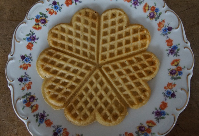 It was interesting to observe how quickly the temperature on the stove decreased. Already five minutes after baking the first waffle, the second waffle did hardly get crispy (it looks nice and even though, because I used a little more dough).