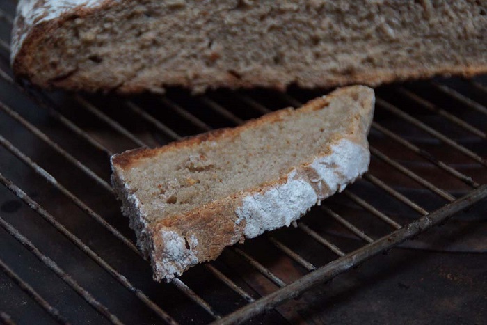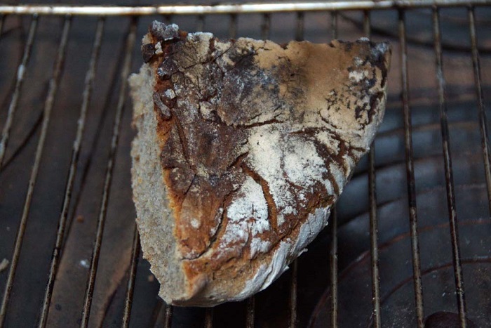 90 Minuten ließ ich das Brot im Holzofen. Unten kross, aber nicht verbrannt. Innere Konsistenz: super durchgebacken.