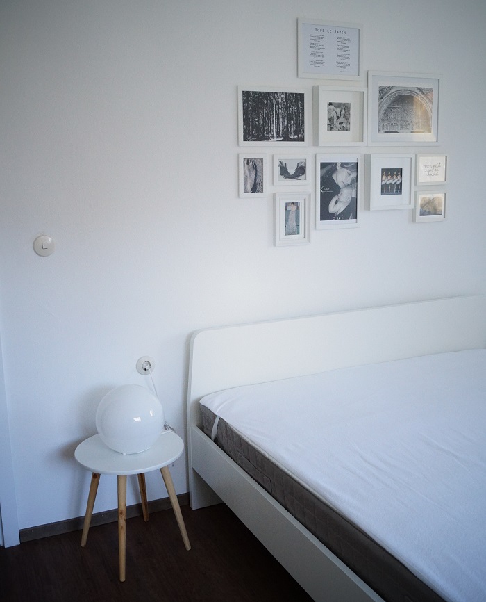 Auch wenn ich meine Prioritäten generell klar setze und Details eher zu kurz kommen, etwas kreativ geworden bin ich vor einiger Zeit trotzdem: das Arrangement einer Bildcollage im weißen Zimmer. Ich hab mich für eine Petersburger Hängung entschieden (danke für den Link, Juliane). Das Aufhängen war eine Herausforderung, aber letztendlich hängt alles ziemlich gerade, für mein Empfinden sehr gerade. Die falsch gehämmerten Nagellöcher in den Wänden sieht man zum Glück nicht, die Chancen stehen nämlich gut, dass die hinter dem gleichen oder nächsten Bild versteckt werden ;-)