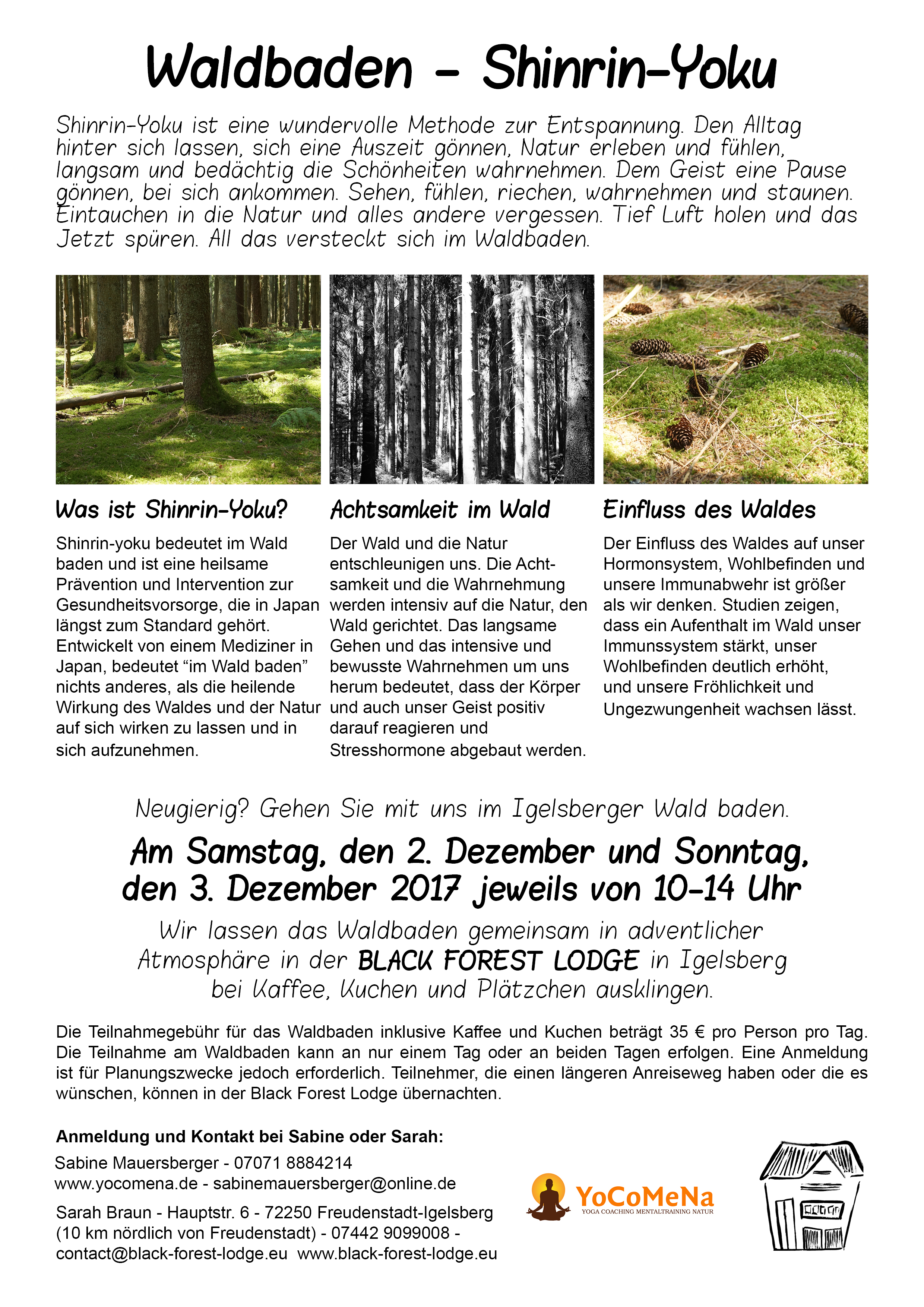Es ging damit los, dass ich im letzten Jahr einen Online-Artikel zu einem neuen Trend aus Japan, dem "Waldbaden" las. Vom Wald so direkt umgeben, fand ich das natürlich interessant, dass Menschen sich treffen, um im Wald baden zu gehen und schrieb auf meinem Blog einen Beitrag hierzu. Mittlerweile ist der Trend auch hier im Schwarzwald angekommen! In meinem Newsletter der Black Forest Lodge vom August erwähnte ich das Thema. Sofort schrieb mir Wolfgang, ein Leser des Newsletters (unbekannterweise Danke für die Kontaktherstellung), dass er vergangenges Wochenende lustigerweise gerade im Wald baden gegangen sei. Zudem schickte er mit die Kontaktdaten der Leiterin dieses Waldbadens und Yogalehrerin, von Sabine (YoCoMeNa). Sie war übrigens genau zu dem Thema vor Kurzem in der Landesschau zu sehen (hier geht's zum Video). Gleichzeitig leitete er meine Daten an Sabine weiter. Worauf Sabine bei mir anrief, vorbei kam und wir gleich ein tolles Event hier geplant haben, auf das ich mich sehr freue. Ihr könnt euch sicher denken, was man hier im Dezember wird tun können... Voilà: