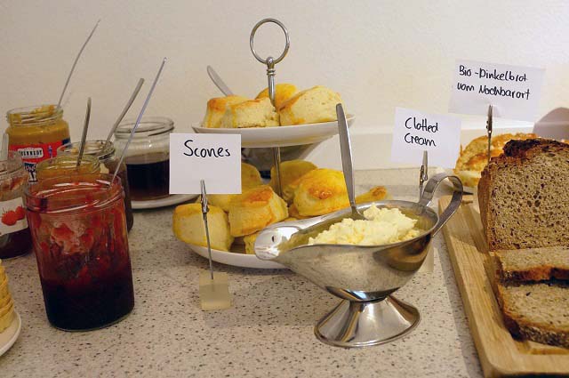 The organic spelt bread from the neighbour village, which has many fans, is served on a regular basis. Many people asked me "this is not some industrial bread, right? You can taste this". But I also serve plain bread rolles... a must for many and the variety is nice, too. People have also noticed that the orange juice is real orange juice. Also that the cheese is good and not the cheapest. Homemade marmelades have become a standard as well. And as you can see on the picture above, the household is not as vegetarian as I am, I also serve ham. Coffee is not regional but fair trade.