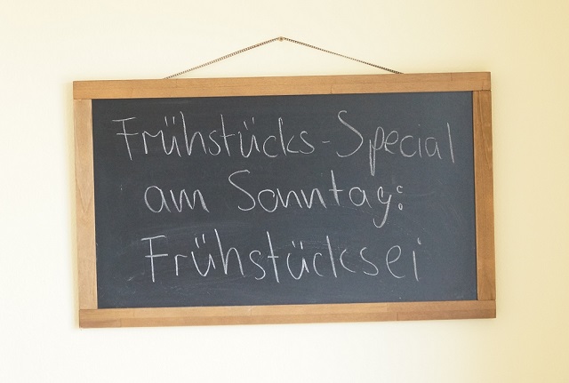 Damit mir nicht langweilig wird (und auch meinen Gästen, die länger bleiben ebensowenig), serviere ich nicht immer genau das gleiche. Und an manchen Tagen gibt es ein "Special", welches ich auf der Tafel anschreibe. Natürlich ist ab und zu ein Ei oder Omelette dabei: