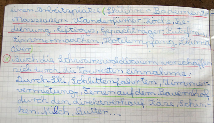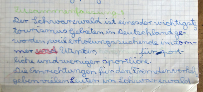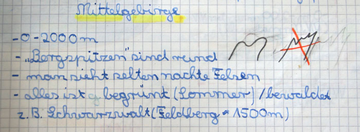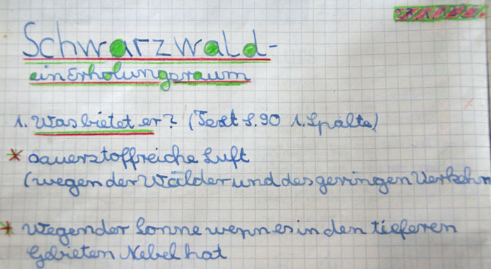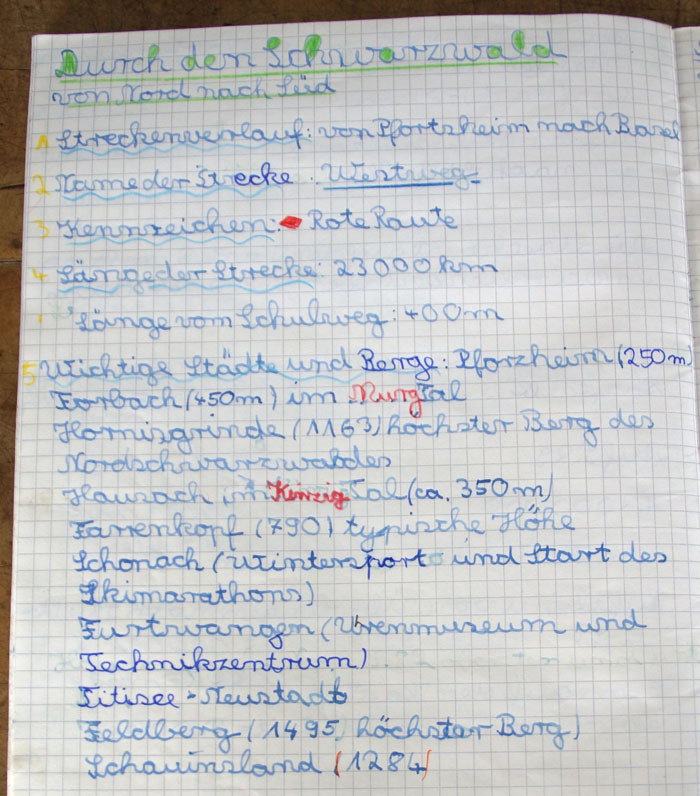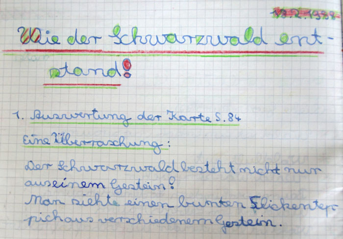 Im Februar habe ich mit meiner Mama eine Kiste mit alten Sachen von mir aussortiert: Zeichnungen, Schulhefte, Klassenarbeiten, Ballettschuhe, Blockflöten, selbstgemachter Perlenschmuck ... 90% der Dinge sind umgehend in den Müll gewandert. Die Aufräumaktion hat sich gelohnt: Wir sind über ein Erdkundeheft von mir, 5. Klasse Gymnasium, gestoßen. Wir haben den Schwarzwald ausführlich behandelt! Das dürfte gut 20 Jahre her sein. Im Folgenden ein paar Auszüge aus den originalen Schulheften (dieser Blogbeitrag ist kein Aprilscherz).