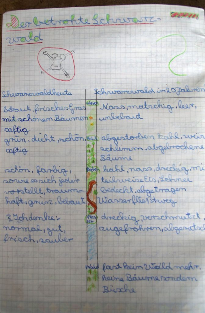 Und zum Schluss noch ein Highlight: der Schwarzwald damals schon betroht! Wir haben ein ziemlich düsteres Bild gezeichnet, wie der Wald wohl in 20 Jahren aussieht (und das war vor ziemlich genau 20 Jahren): Es sollte schon fast keinen Wald mehr geben! Alles ist leer, unbebaut, abgestorben, kahl, wüst, schlimm ... so schnell gings dann nicht. Heute ist der Wald noch schön. Aber definitiv noch bedrohter als vor 20 Jahren.