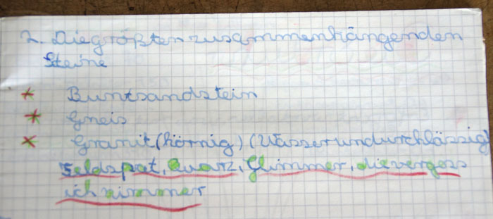 Sogar geografisch sind wir richtig ins Detail gegangen. Granit besteht aus: Feldspat, Quarz, Glimmer, die vergess ich nimmer. Ich hatte es vergessen. Sorry, Herr H. ;-)