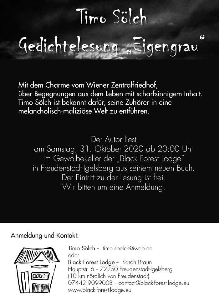 Der Autor liest am Samstag, 31.Oktober 2020, ab 20:00Uhr im Gewölbekeller der „Black Forest Lodge“ in Freudenstadt-Igelsberg aus seinem neuen Buch.