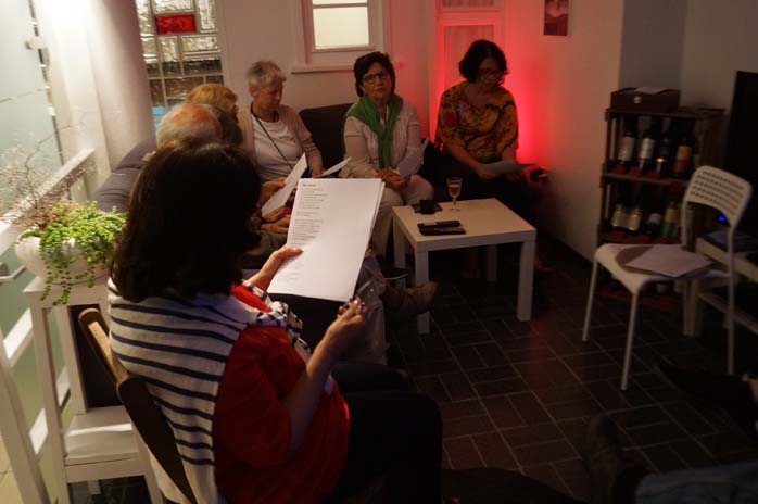 En deux mots: c'était formidable! Nous avons passé une belle soirée. Nous, cela veut dire qu'il y avait 10 participants et moi. J'étais vraiment surprise comme je n'avais pas fait beaucoup de publicité pour cet événement, je le voyais comme un essai spontané. Et voilà ... plus de participants que pour d'autres événements longuement planifiés (ceci confirme le fait que parfois, je ferais mieux d'être plus relaxée et spontanée ... j'y travaille). La fraction la plus grande, c'était les Allemands francophiles. Mais il y avait une Française! Et c'était international grâce à une amie iranienne et une hôte brésilienne.
