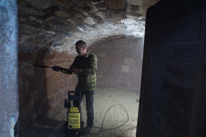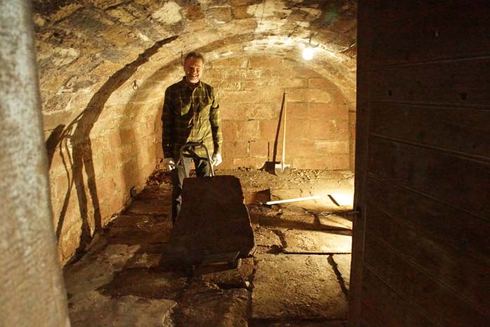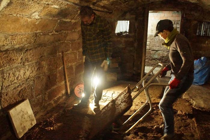 Gleiches Lächeln, gleicher Tatendrank. Neue Baustelle, neues Karohemd. Ein Bild fast wie in alten Zeiten. Zunächst war der Boden dran. Die äußerst unebenen Sandsteinplatten wurden in Handarbeit entfernt.